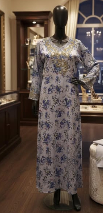 A soft floral abaya with a graceful full-length fall and a lighter occasion mood.